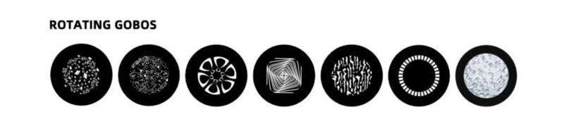 - Roterende Gobo: 7 pluggable glazen gobo's, met variabele snelheid dithering en bidirectionele rotatie